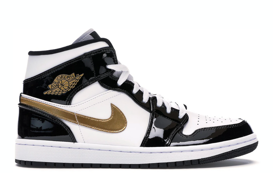 Jordan 1 Mid Patent Black White Gold